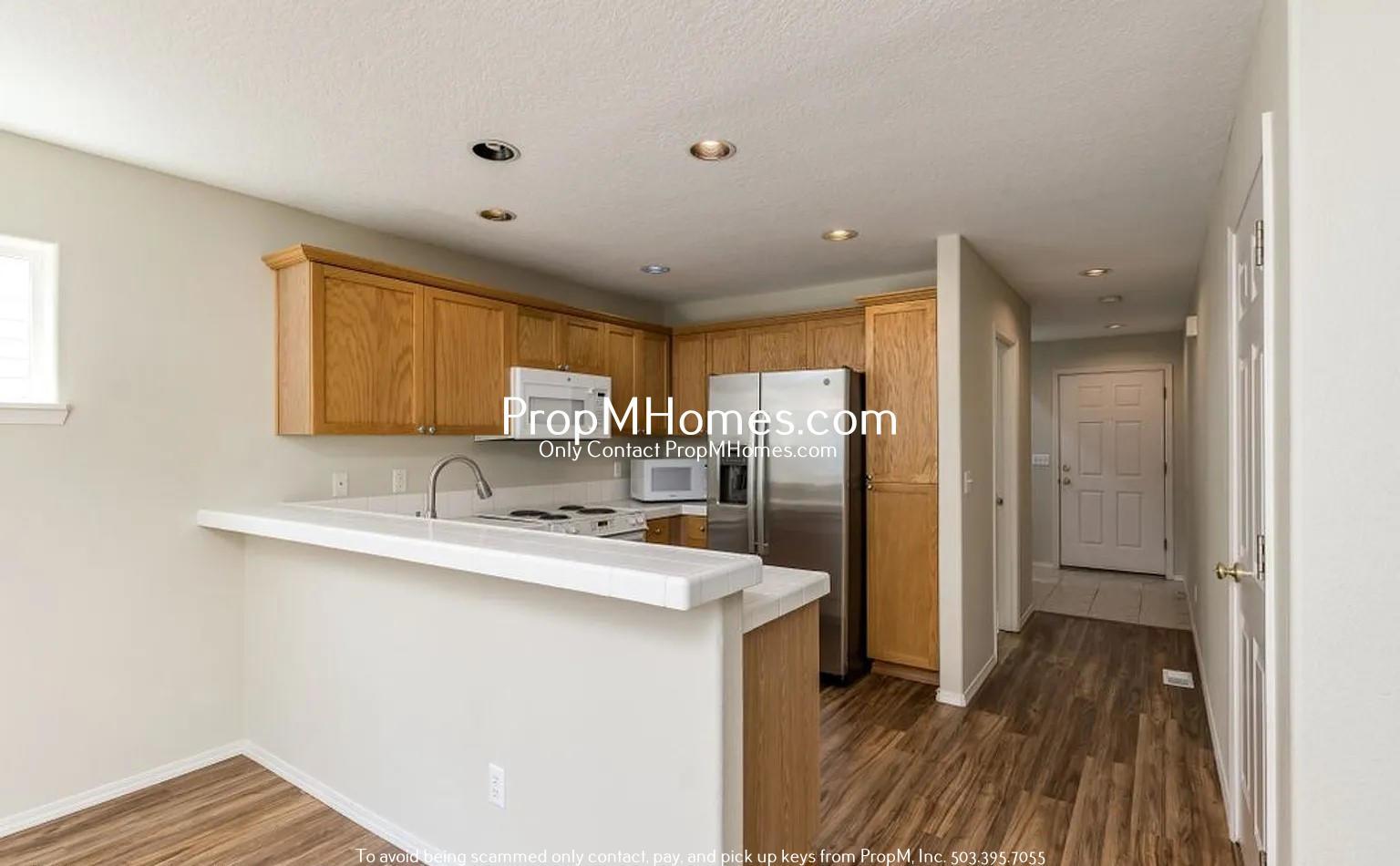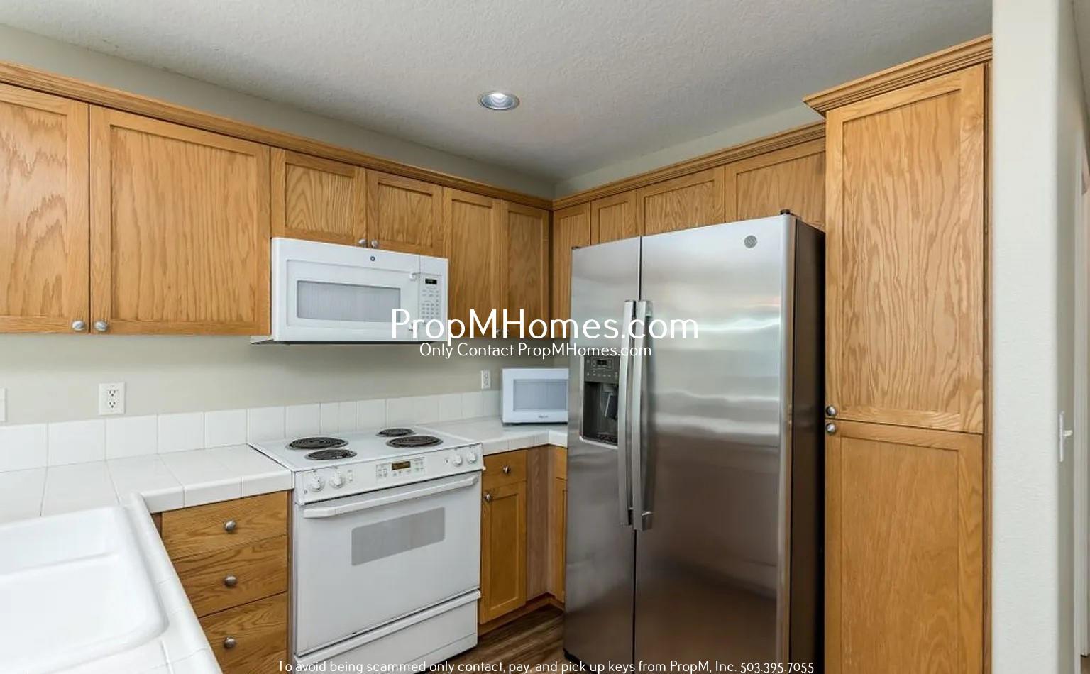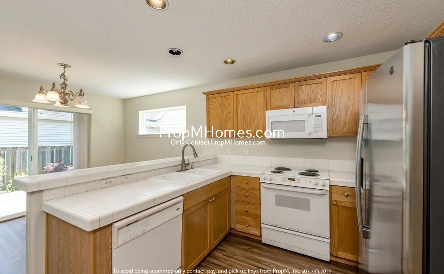 This kitchen is designed for both style and functionality! Enjoy ample counter space, sleek tile countertops, and warm wood cabinetry. Complete with modern appliances—including a refrigerator, electric stove, microwave, and dishwasher—this space makes meal prep a breeze. The open layout connects to the dining area, allowing you to stay engaged with family and guests while cooking.