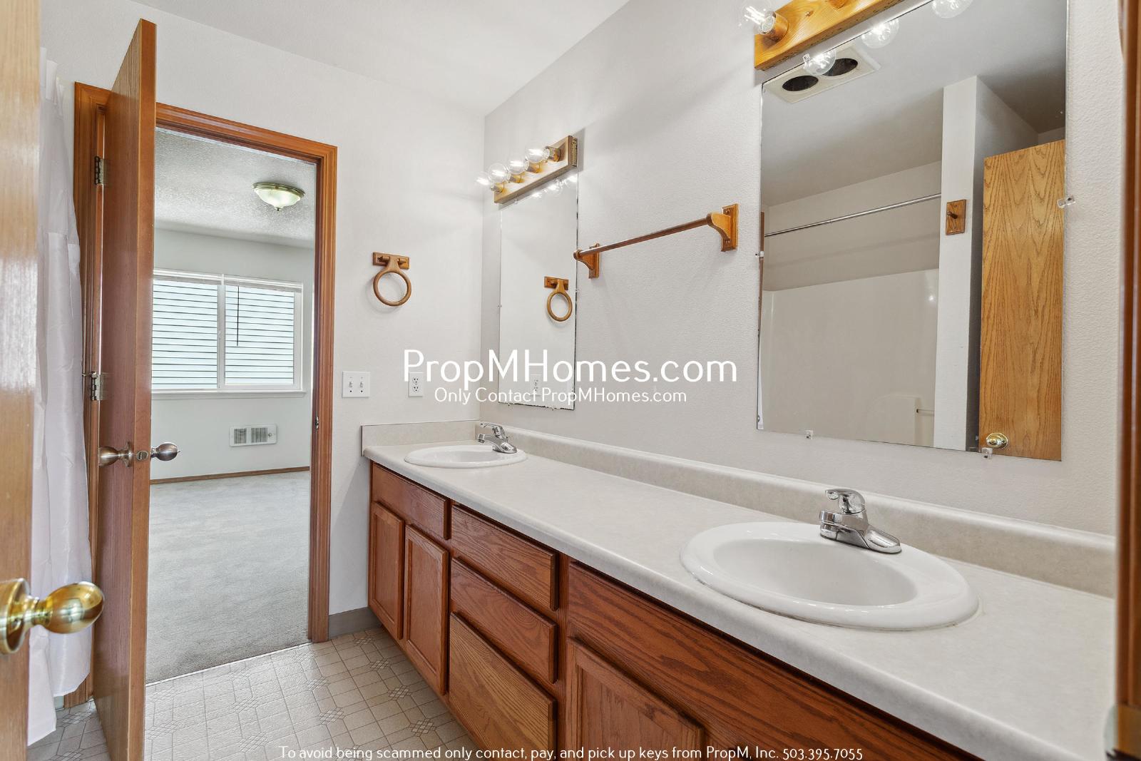 Enjoy two generously sized upstairs bedrooms with plush carpet, ample closet space, and large windows overlooking greenery. The full Jack-and-Jill bathroom boasts dual vanities for convenience and a shower/tub combo. There’s also a half-bath downstairs for guests. This thoughtful layout is ideal for roommates, couples, or families.