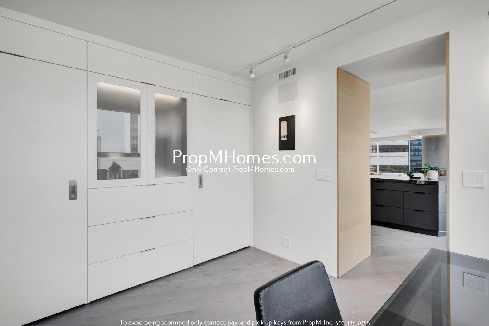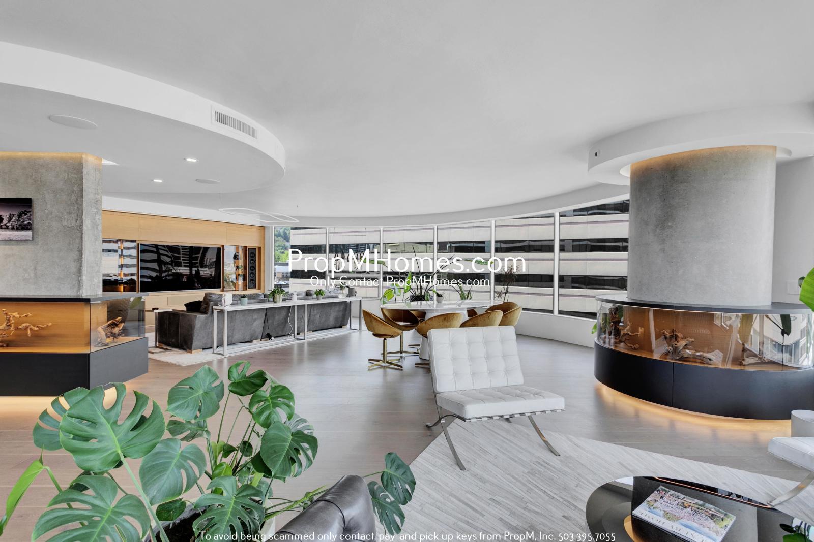 Step into an architectural masterpiece with sweeping views of the Portland skyline through floor-to-ceiling curved glass. The open-concept living room is wrapped in elegance, with sleek oak floors, designer lighting, and built-in glass displays that blend modern warmth with striking visual appeal. Ample space for entertaining or relaxing while soaking in the cityscape.