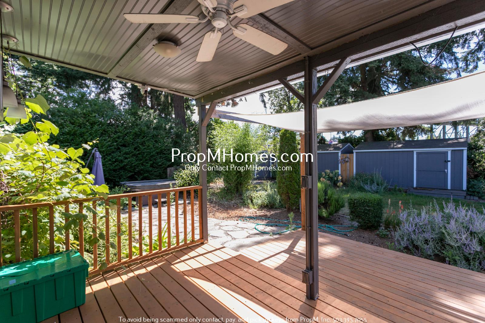 -Fully fenced yard with a covered deck and a large patio—perfect for grilling, container gardening, or pet play