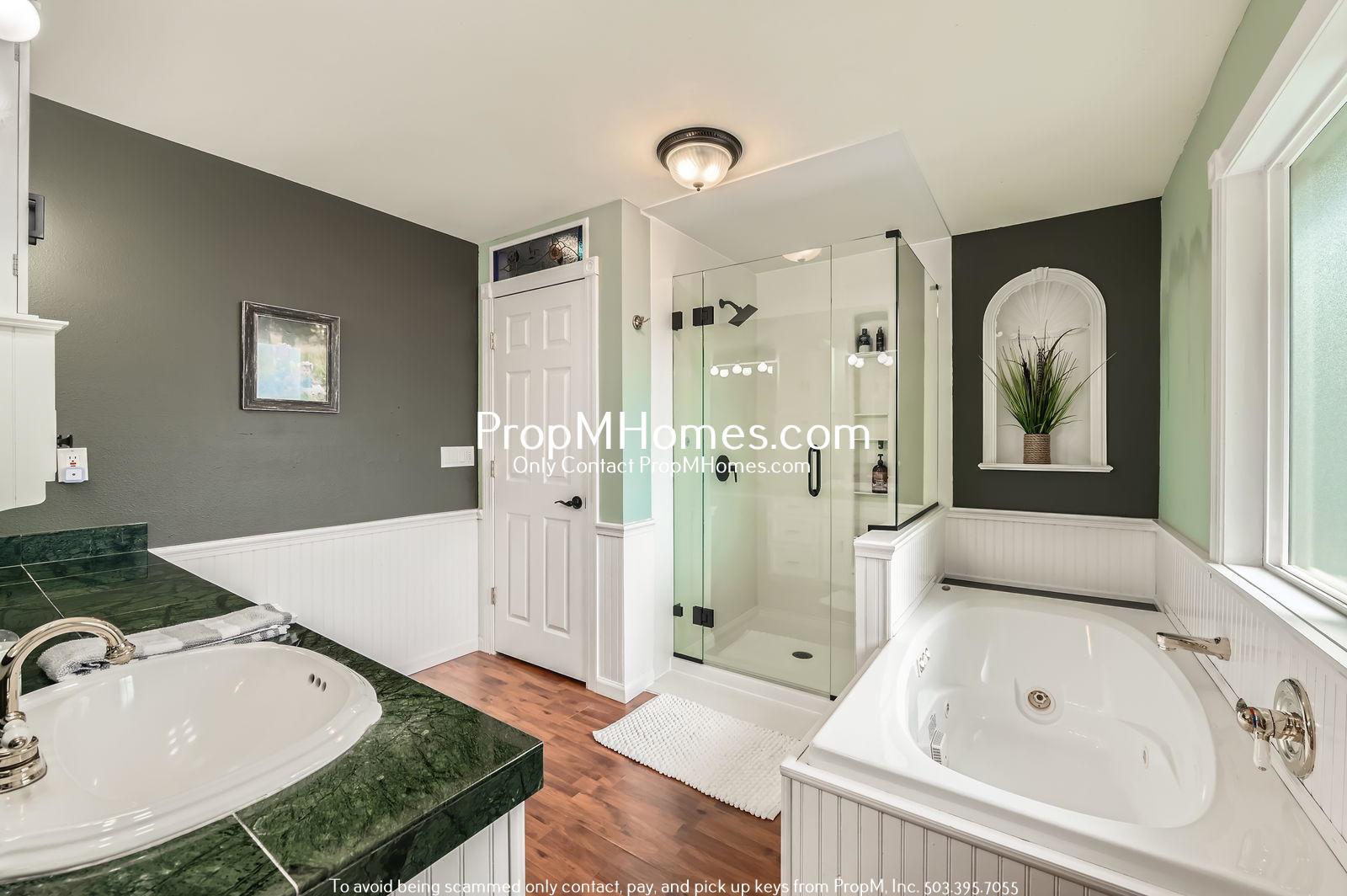 -Expansive primary suite with a walk-in closet and a luxurious ensuite bath with dual sinks, a jetted tub, and a glass-enclosed shower