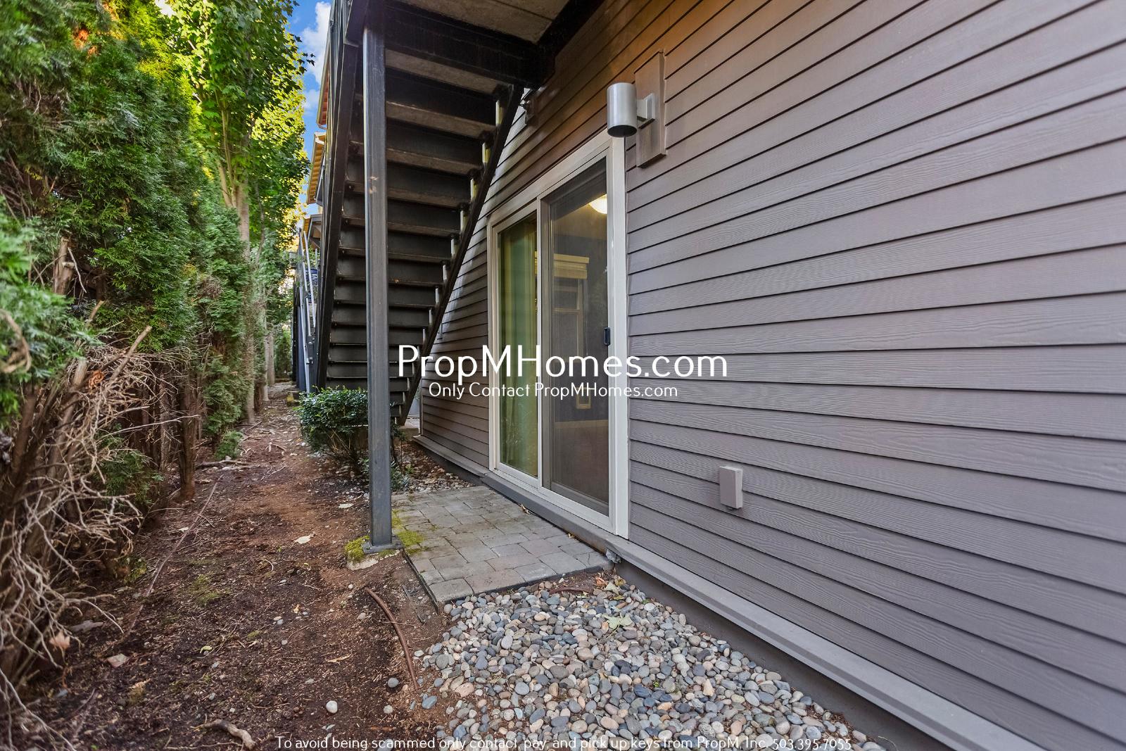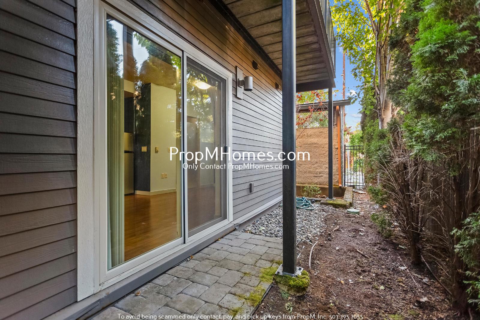 -Sliding glass door opens to private patio space with gravel path and mature greenery