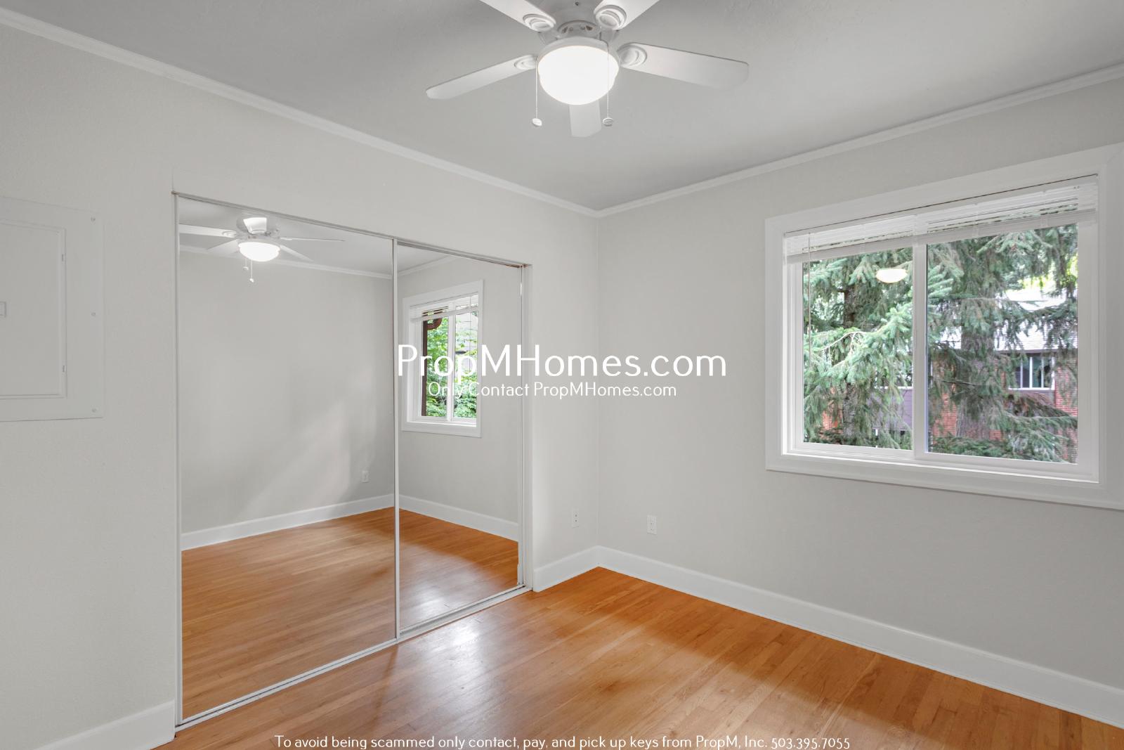 -Spacious bedroom with hardwood flooring and mirrored closet