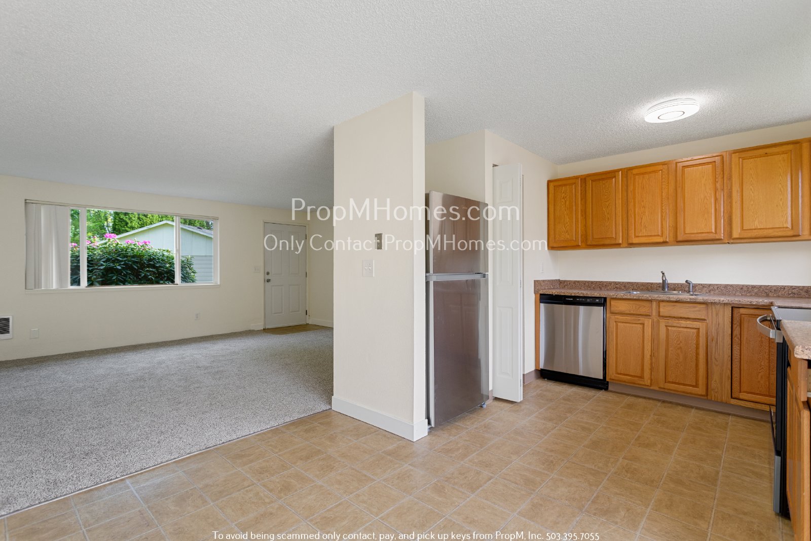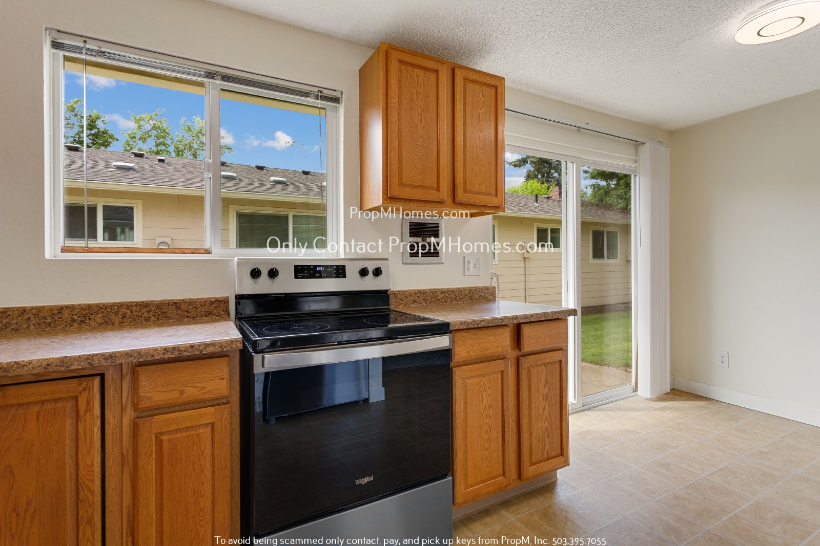 Designed for comfort and convenience, this kitchen flows effortlessly into the dining area, making it ideal for cooking and entertaining. It features durable laminate countertops with plenty of workspace and ample cabinet storage. The kitchen comes equipped with new stainless steel appliances, including a dishwasher, refrigerator, and electric range, offering both functionality and a clean, modern look.