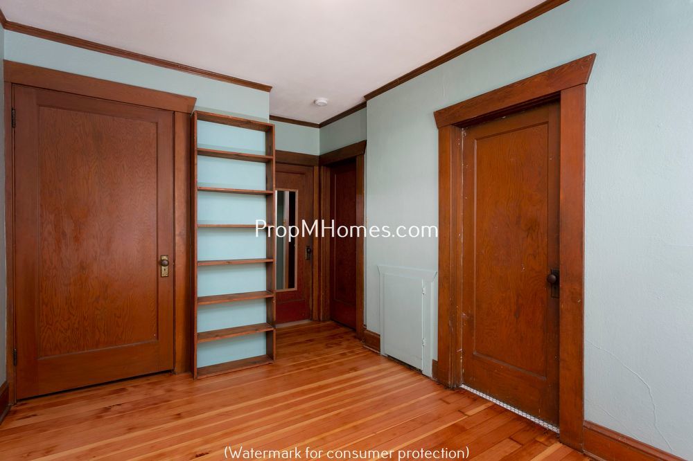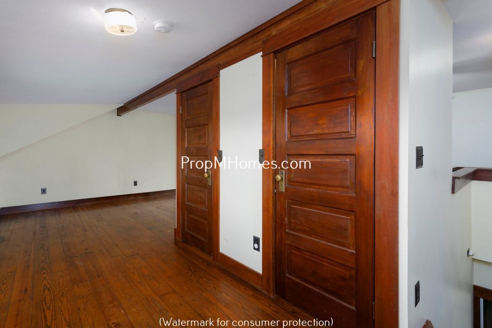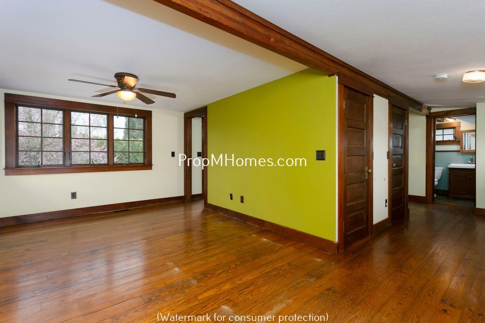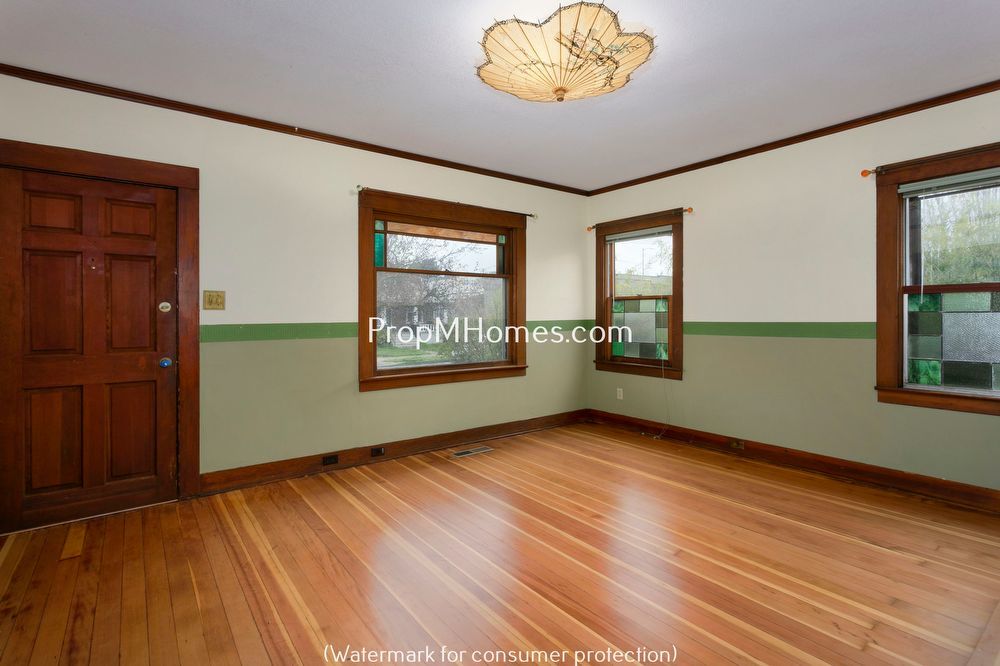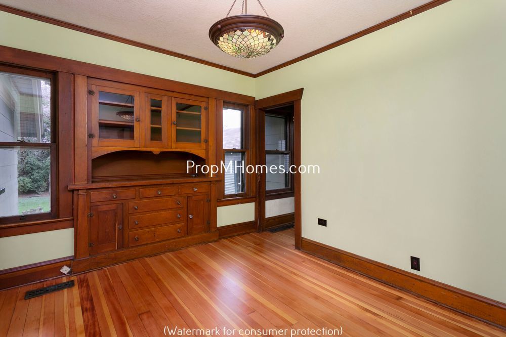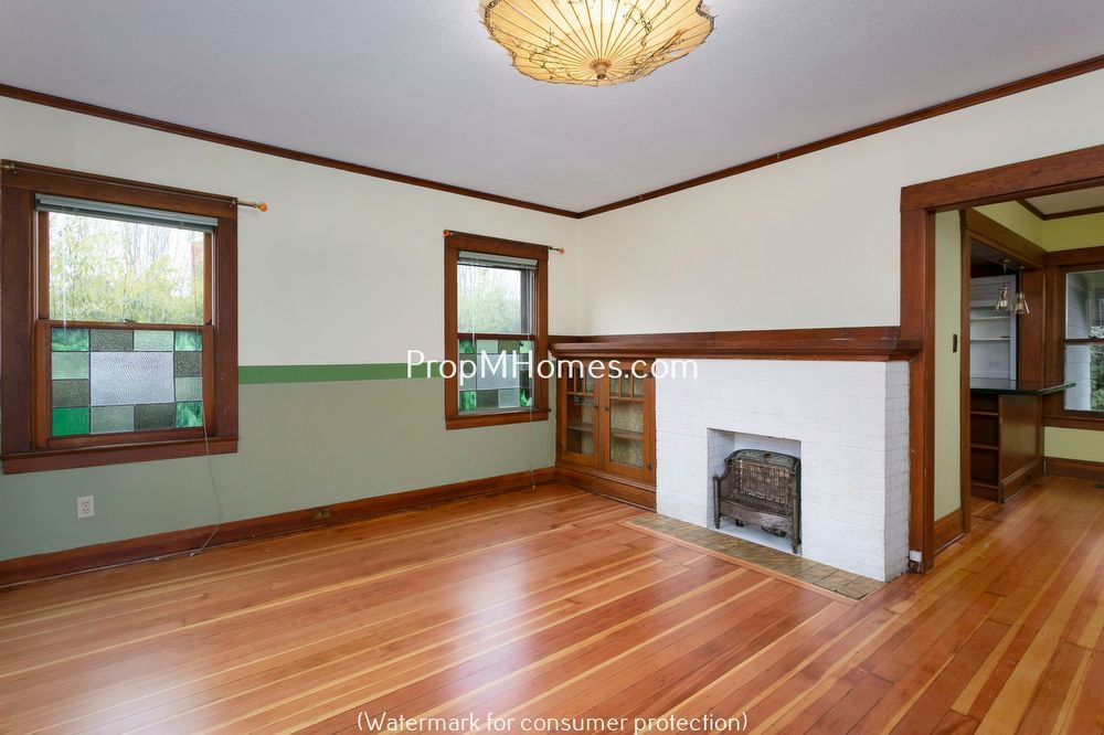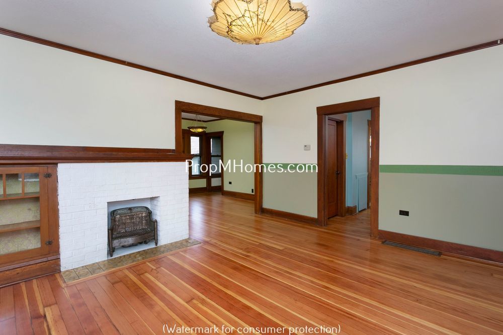 The living room of this home exudes classic charm and elegance, featuring beautiful hardwood floors that extend throughout the space. A white brick fireplace serves as a focal point, complemented by original built-in cabinetry that adds character and functional storage. The room is illuminated by a unique ceiling light fixture resembling an umbrella or parasol, casting a soft glow across the neutral-toned walls. Large doorways suggest an open floor plan, while rich, dark wood trim around the doorways and baseboards provides a striking contrast to the lighter walls. This living room offers a perfect blend of vintage appeal and modern livability, creating an inviting atmosphere for relaxation and entertaining.