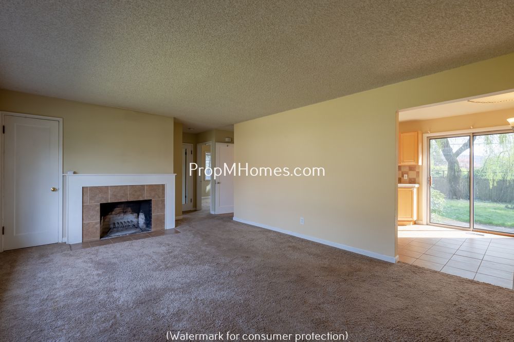 Step into a sun-drenched living room that features plush carpet, a cozy wood-burning fireplace, and a picture window with serene neighborhood views. The open layout flows seamlessly into the dining area, making it ideal for relaxing or hosting friends and family.