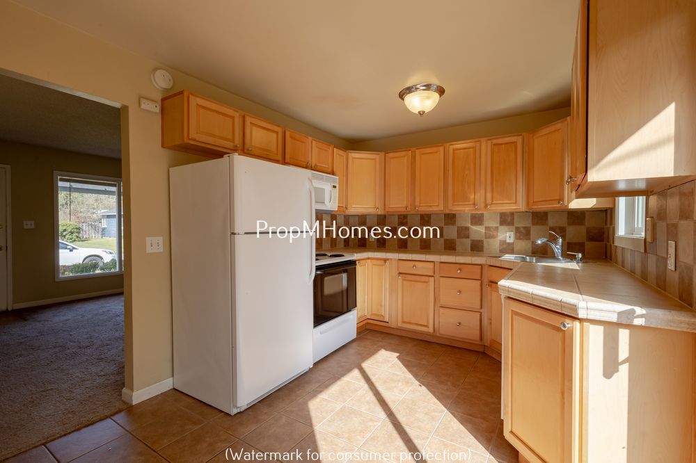 The bright and functional kitchen boasts warm wood cabinetry, tile countertops, and backsplash. There's plenty of counter space for prep, and large windows fill the room with natural light while offering views of the backyard.
