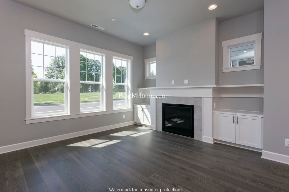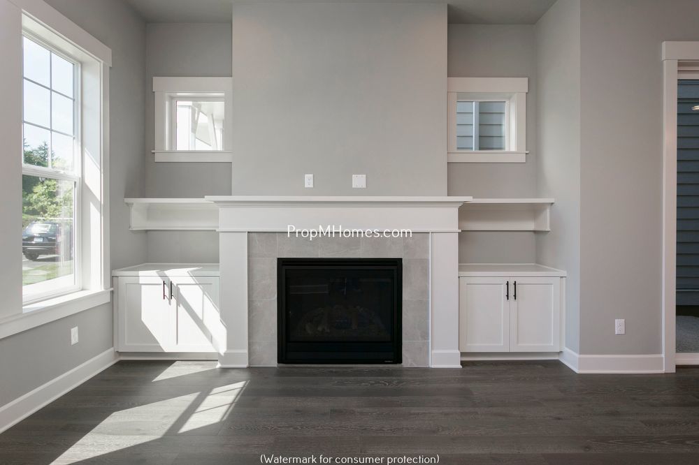 -Gas fireplace with designer tile and tall wood-wrapped windows