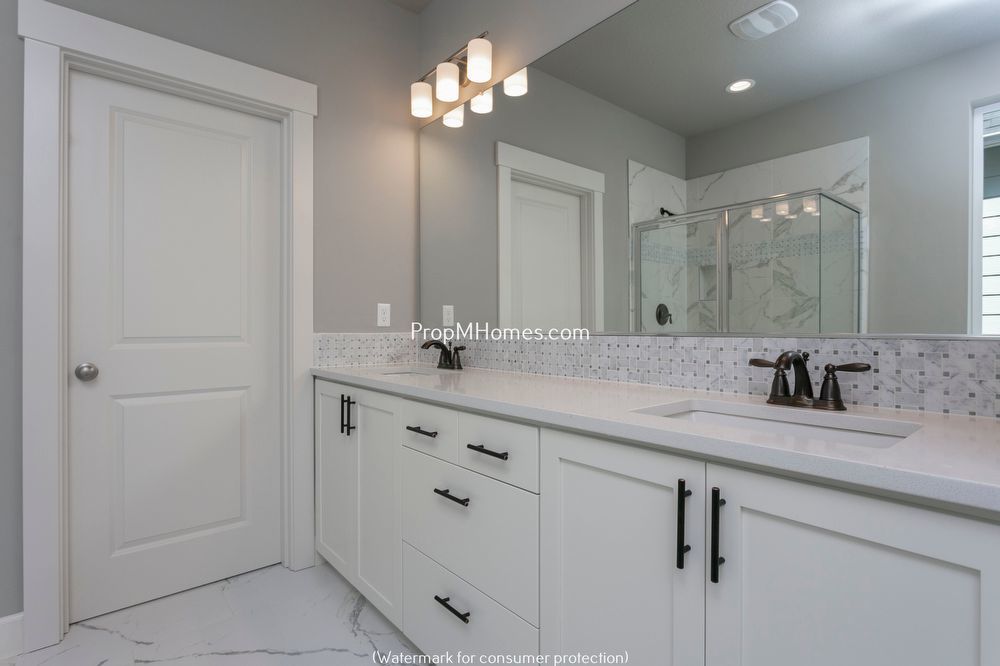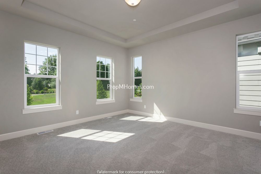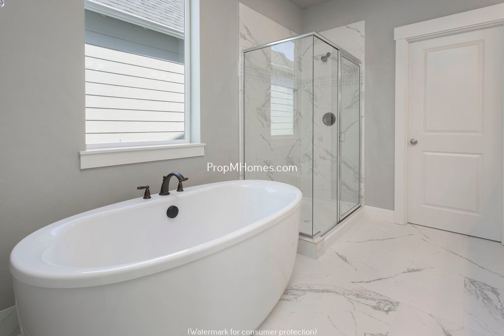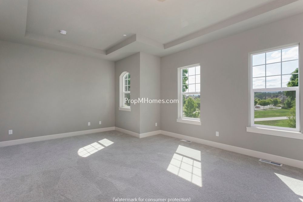 -Primary features tray ceiling, walk-in closet, soaking tub, large tiled shower, and dual vanity