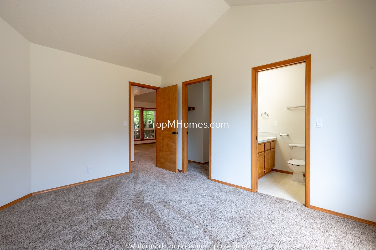 -Spacious primary suite with vaulted ceilings, private bath, and walk-in shower