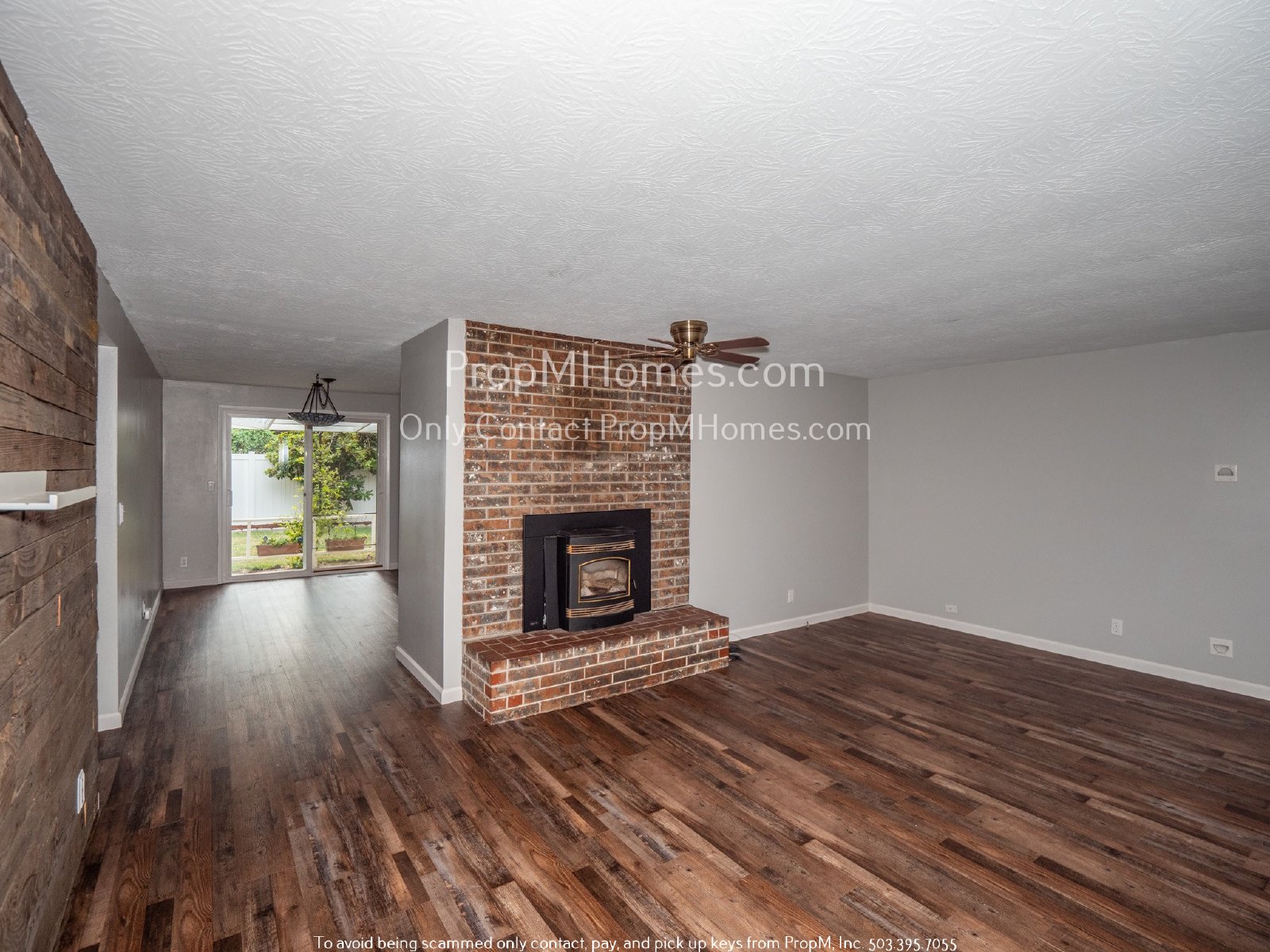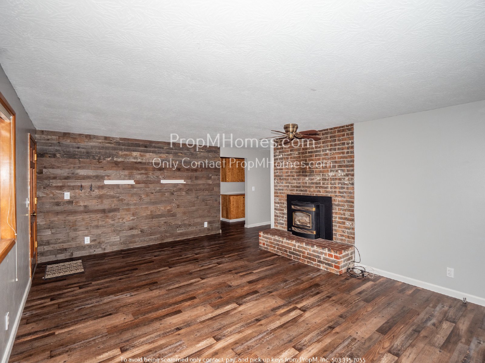 Step into the inviting living area of your wonderful ranch-style home, where comfort and style harmoniously blend. The space boasts a cozy wood pellet fireplace, perfect for chilly evenings, and a ceiling fan that ensures year-round comfort. A trendy accent wall adds a modern flair, creating a focal point that ties the room together beautifully. Just steps away, the well-designed kitchen and dining area offer convenience and functionality, making it easy to entertain guests or enjoy family meals. This living area is truly the heart of your home, providing a warm and welcoming atmosphere for all.
