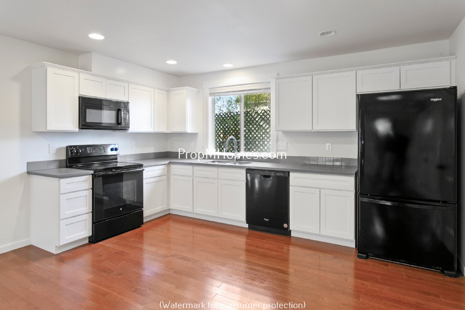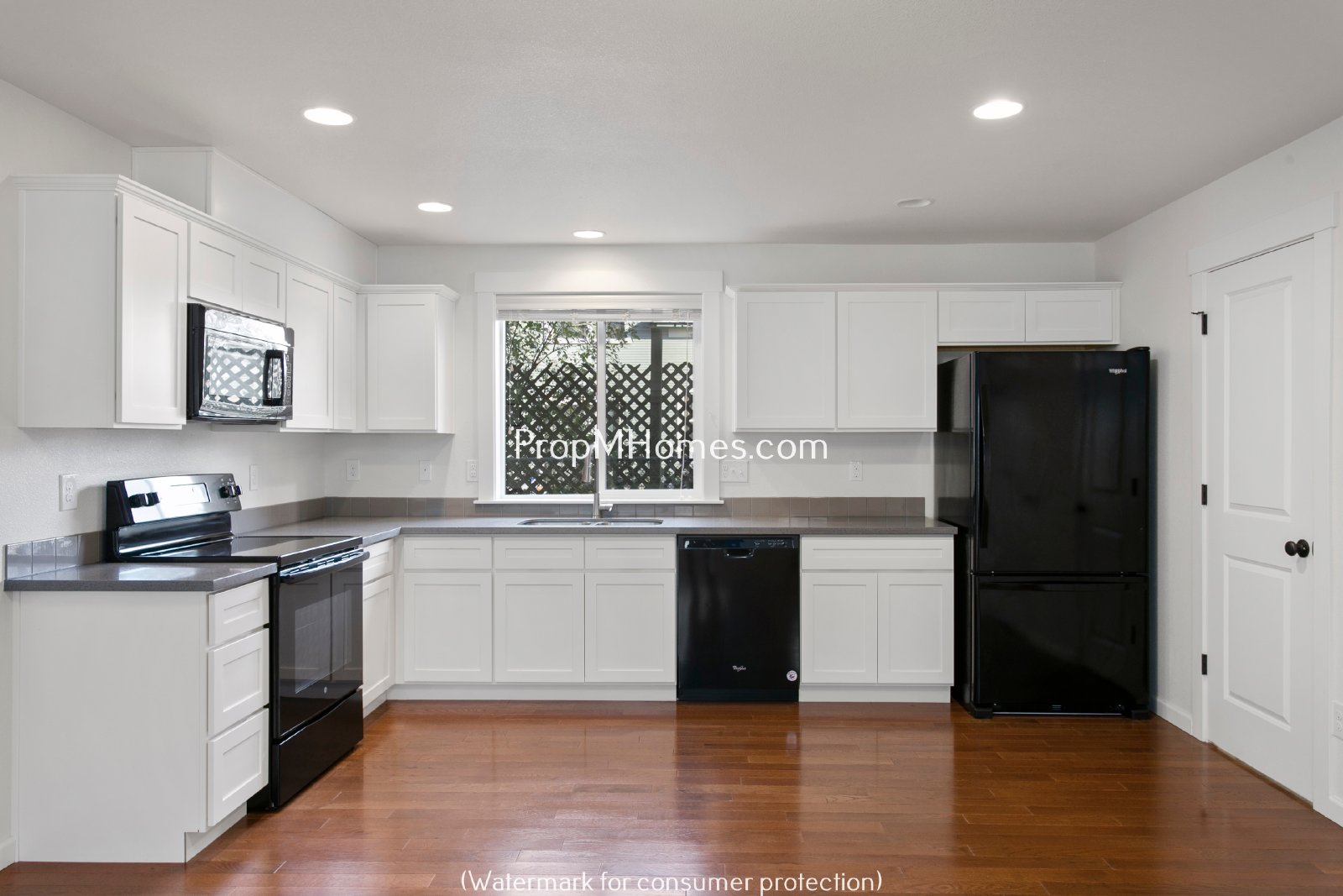 -Stainless steel appliances: refrigerator, dishwasher, microwave, and electric range