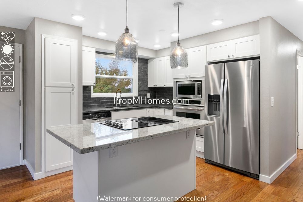 Your kitchen features a gourmet large island with modern lighting, quartz counters, all-white shaker style cabinets, black brick accent backsplash, and stainless appliances including a refrigerator, built-in microwave, electric oven/stove, and dishwasher.