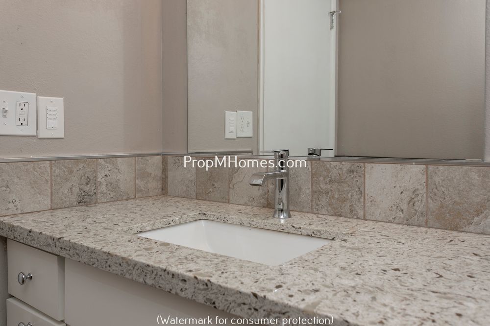 The bathroom features a quartz tile counter and a shower/tub combination, making it the perfect sanctuary to start or end your day.