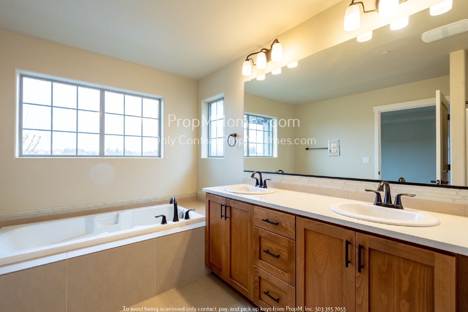 -Luxurious primary suite with soaking tub, dual sinks, walk-in shower, and large walk-in closet